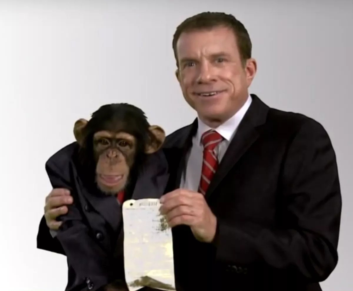 Then came the punch line: “If you think any monkey in a suit can fight your traffic ticket, think again!” Gold beamed. The chimp jumped up and hugged Gold’s neck as the Ticket Clinic’s number flashed across the screen.