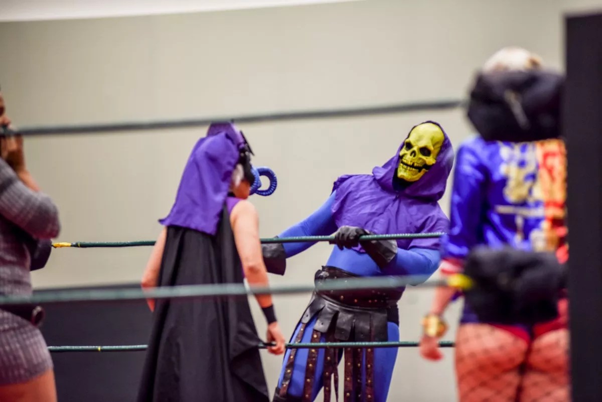 Skeletor steps in the ring at Fantasy Super Cosplay Wrestling at Florida Supercon in 2017.