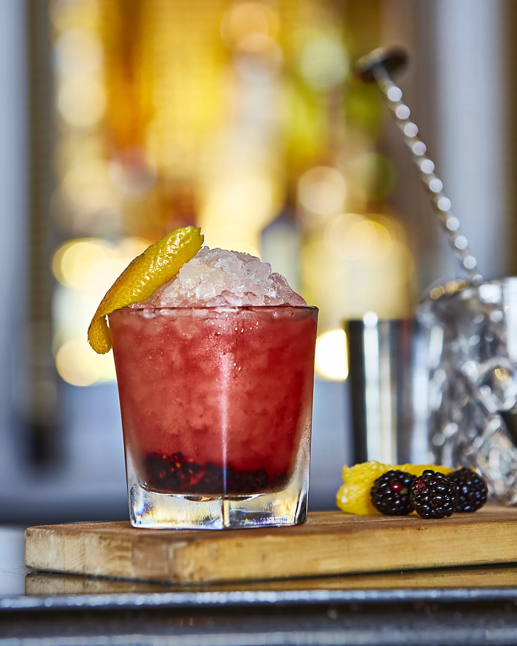 Another favorite new drink showcasing Mallory’s signature touch is the Happy Sac, which is made with her in-house oleo saccharum, something that sounds like it belongs on an anatomy diagram (you decide where) but is actually a fashionable ingredient used to add an extra punch to cocktails. The word literally translates to “oily sugar” and has made a comeback from when it was popularly used in mid-19th-century bartending. The process is simple: Infuse sugar with the rind of citrus. No heat is added – the oils in the citrus break down the sugar and really intensify the flavor. Mallory’s orange oleo saccharum, used in the Happy Sac, also contains brown sugar and thyme. The cocktail also uses Ketel One Oranje, blackberries, lime juice, and crushed ice. “We muddle the blackberries in the glass first, then put a mound of crushed ice on top of that, so when you pour the cocktail in, it kind of marries with the blackberry and creates almost this tie-dye effect. It’s really pleasing to the eye. Then the flavor itself is great.”