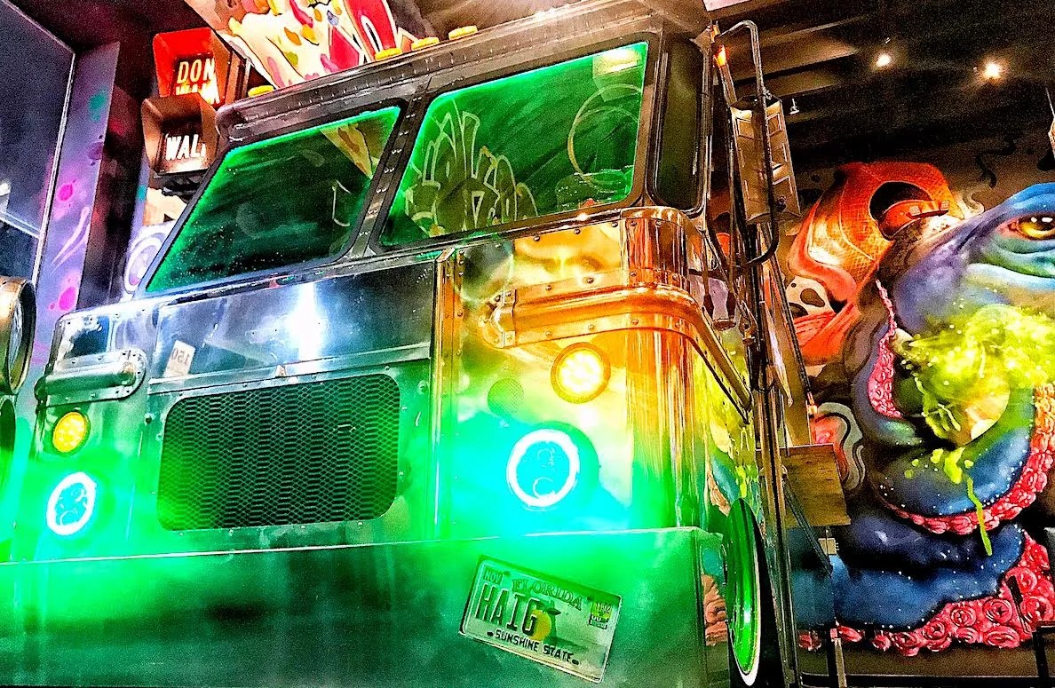 Keeping with the first location’s unique concept, Brgr Stop Fort Lauderdale is a feast for the senses with its colorful, urban-themed art and decor and indulgent menu items. Most of the interior design is handcrafted by Buchinski and Cahow, from a giant street sign mosaic wall to the 1947 Ford truck cab behind a custom steel bar that houses 28 beer taps, ten of which pour from the copperplate bumper.
