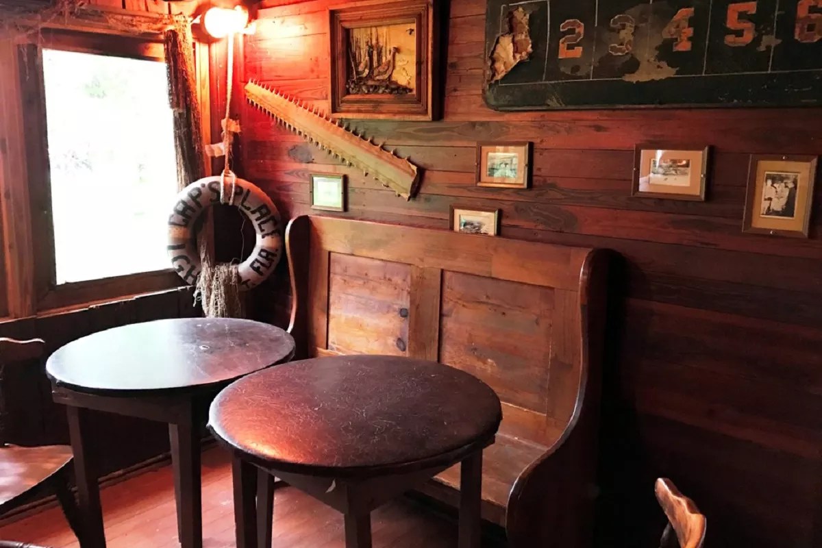 According to the National Register of Historic Places, “Fishnets served as curtains and parts of ships, rope, driftwood, and harpoons hung haphazardly from the ceilings.” The walls were lined with shark jaws and rattlesnake skins. Hasis built the distinctive bar using a bowsprit salvaged from a sunken wreck. The bar is topped with old ship decking. Hawser lines used on the original barge are wrapped around a large piling in the bar.