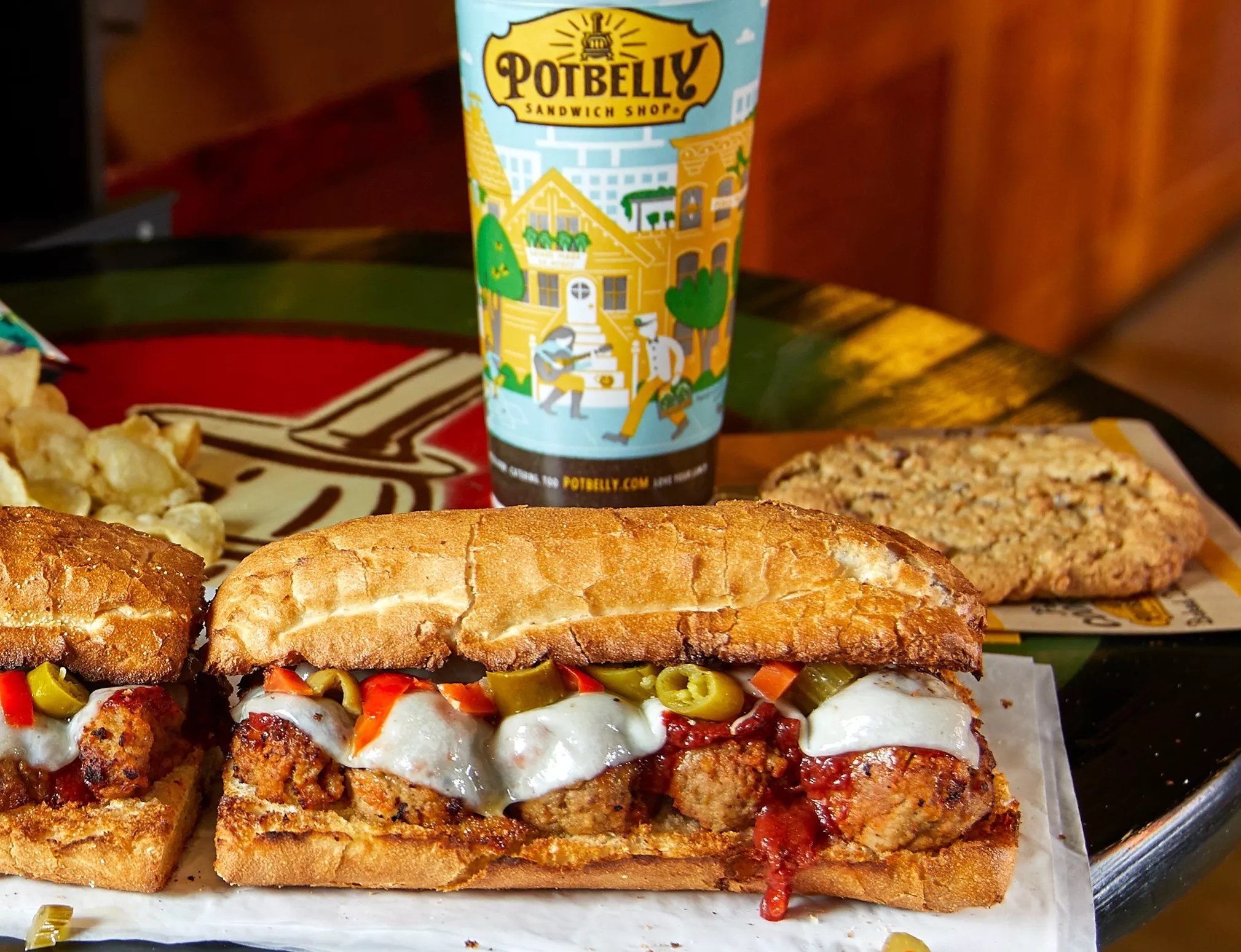 Ever since, Potbelly has carved out a niche serving toasted sandwiches that land somewhere between classic deli and comfort food. Its best-known item, the “A Wreck,” layers multiple meats (turkey breast, hickory-smoked ham, Angus roast beef, and salami) with Swiss cheese on house-baked bread, then runs it through a toaster for a signature crunch. Other mainstays include the meatball sandwich and the “Mediterranean,” featuring grilled chicken, feta, zesty hummus, artichoke hearts, roasted red peppers, and cucumbers.