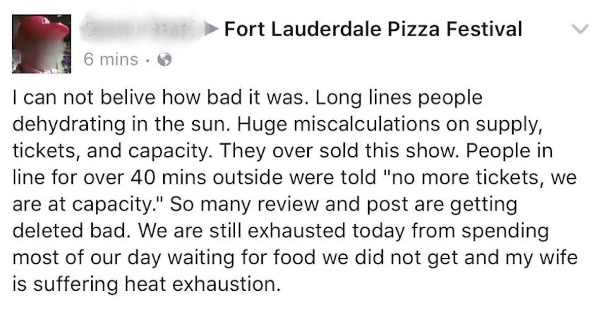 The inaugural event, which took place at the city’s War Memorial Auditorium, was successful in drawing large and eager crowds, many of whom stood in line for hours without receiving any food or drinks. In reaction, dozens of attendees swarmed the festival’s Facebook page Sunday to report their experience. Numerous public posts to the page, including some pictured below, have since been deleted.