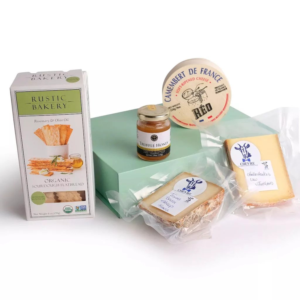 Vecino’s “Thinking of You” kit includes the perfect building blocks for a romantic evening. Set the mood with a candle labeled “Make Love Not War” from Wynwood’s boutique store Frangipani, followed by a toast with Adami Garbel brut prosecco. Finish with a sweet ending of a raw chocolate bar ($45). A gourmet gift box by Chèvre Miami is also available, featuring a combo of European specialty cheeses, accompanied by Rustic Bakery organic sourdough crackers and truffle honey ($75). Both options are available on the market’s website.