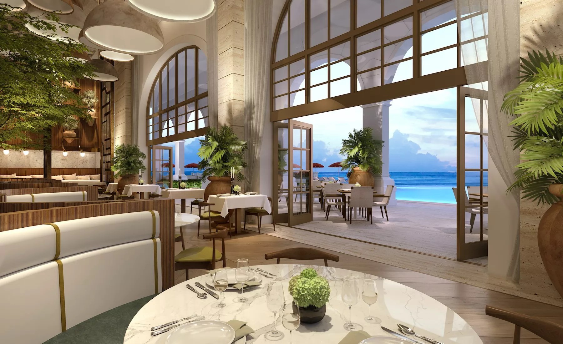 When completed, large indoor and outdoor dining areas will overlook the property’s beachfront infinity pool and the Atlantic Ocean beyond. Designed by the STA Architectural Group, the 10,000-square-foot space will take advantage of the views with 28-foot ceilings and floor-to-ceiling windows.
