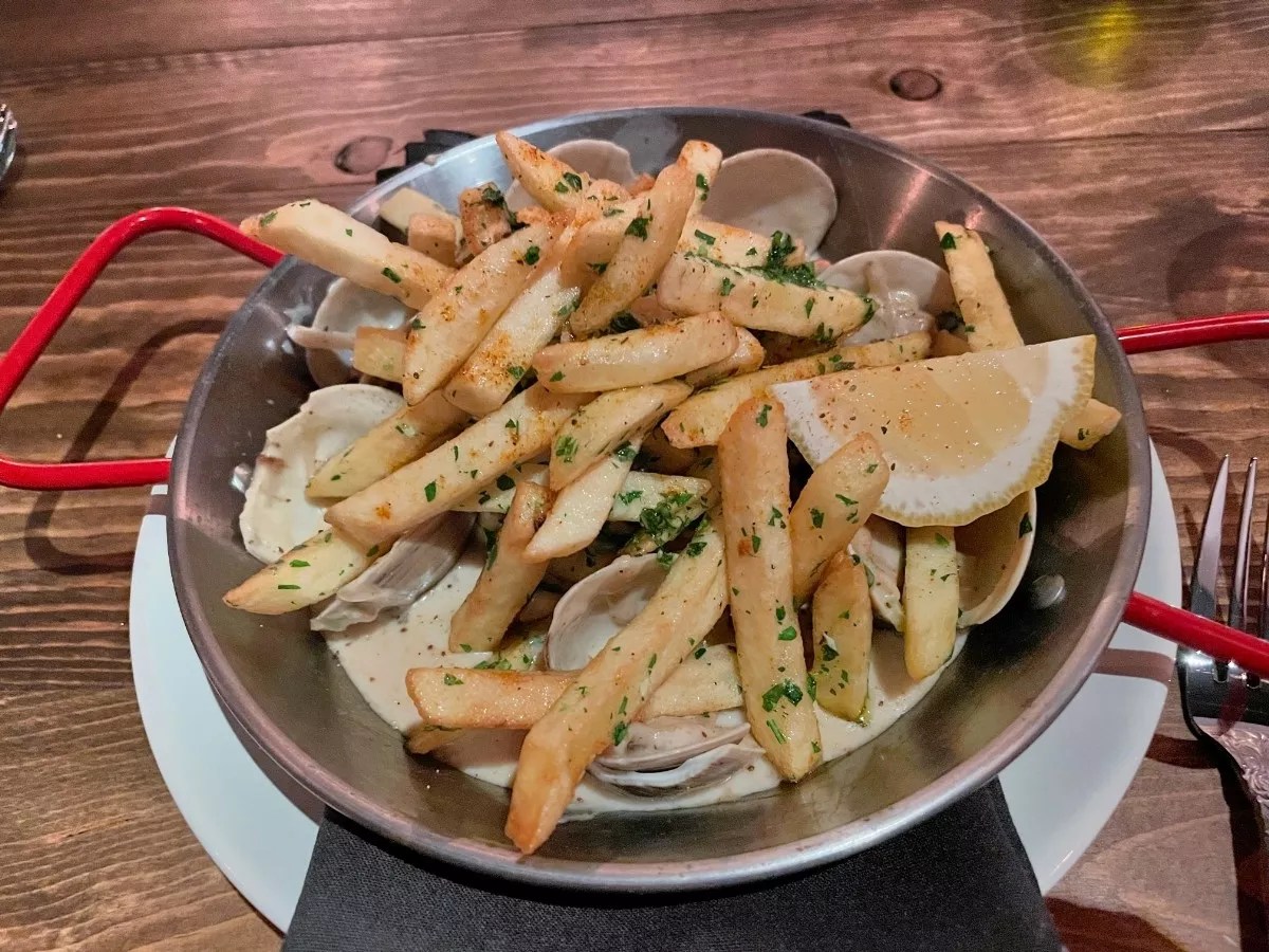 An order of clam chowder fries ($18), for instance, grew from Timon’s days growing up in the San Francisco Bay area, coupled with time working in Belgium as an adult, mixed in with Marissa’s love of clams and French fries. “After work in Belgium, we would have moules frites. Marissa loves clams and fries, so we thought up this mashup.” The fries, seasoned with Old Bay, are crisp and hot; the clams sweet and tender, rest on a bed of chowder. Whether you select the dish as an appetizer for the table, a side, or just sit at the bar with a glass of wine, order these fries.