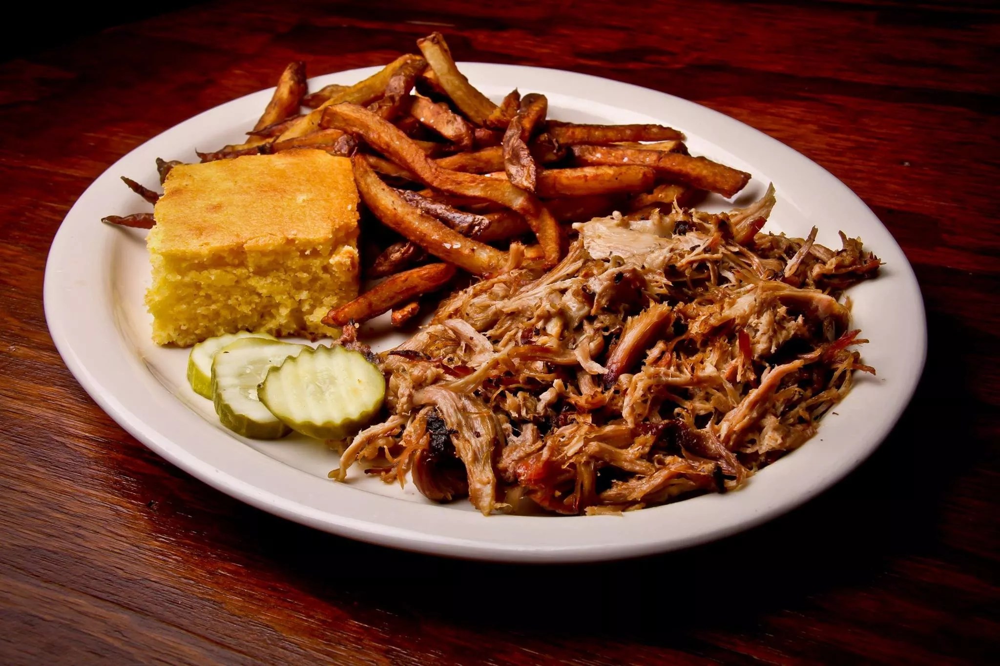 Pulled pork with Brother Jimmy’s Carolina barbecue sauce.