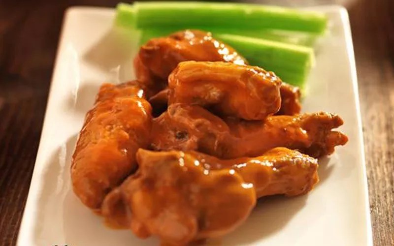 Bru’s Room’s grilled wings smothered in hot sauce.