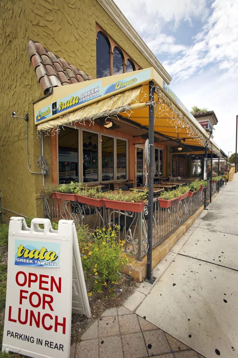 For great people-watching without the worry of bare feet dancing tabletop next to your appetizer, pay a visit to the sleek new Trata Greek Taverna on Las Olas Boulevard. The upscale eatery has several tables outside on a romantically lit covered patio, along with a dozen tables and a chic bar inside. The menu is loaded with traditional favorites from the motherland, starting with appetizers such as grilled baby squid, marides (AKA pan-fried smelts), and everybody’s favorite flaming saganaki cheese. Entr