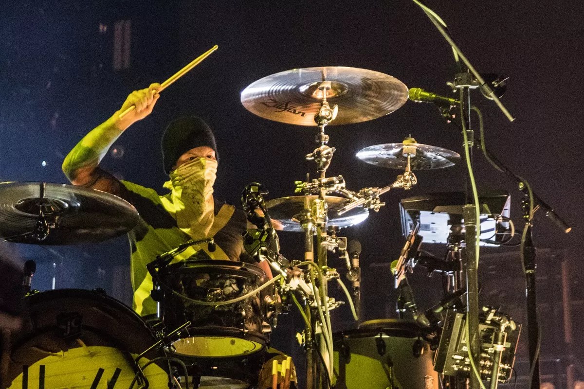 Heading straight to his drums, Dun wore a bandanna over the lower half of his face and the band’s signature “X” in yellow tape across his chest.