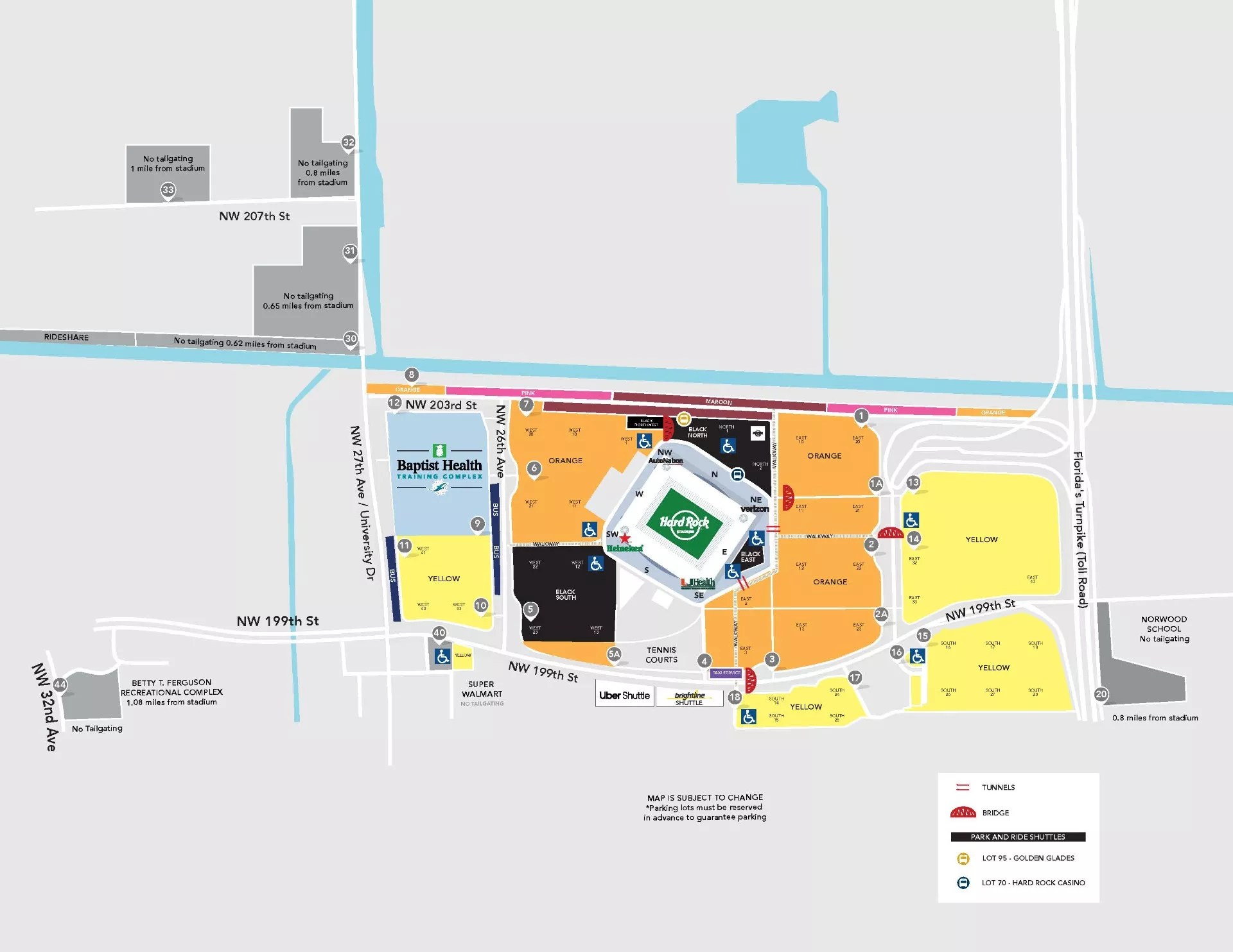 There are also two park-and-ride lots. One is located at the Golden Glades Parking Garage (16000 NW Seventh Ave., Miami), and the other is across the street from the Seminole Hard Rock Hotel & Casino (5700 FL-7, Fort Lauderdale). From there, a shuttle will take you to the stadium. The shuttle is complimentary, so if you are staying at the Seminole Hard Rock Hotel, you don’t need to purchase a parking – you can hop on the shuttle and go.