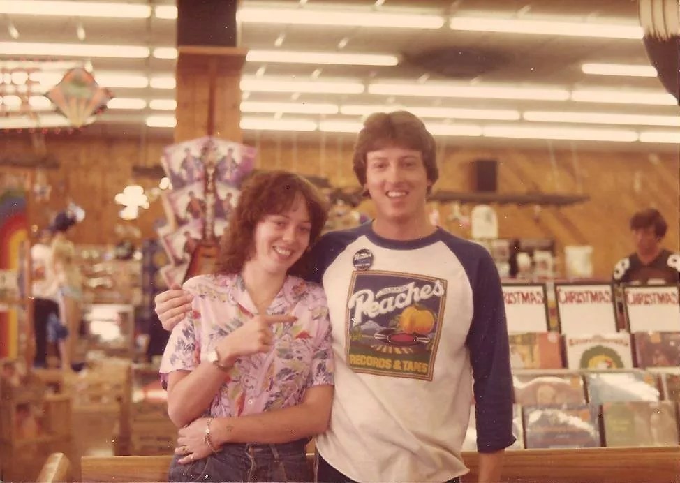 Step back in time as you imagine a 10,000-square-foot store with wood-paneled walls and faux-red-brick flooring that stretched for days. Wooden fruit crates, overflowing with vinyl records, bore the colorful signature peach logo. Six-foot-tall album-cover replicas lined the façade, spotlighted for all to admire. They and the merchandise bearing the familiar logo were staples of a beloved music sanctuary.