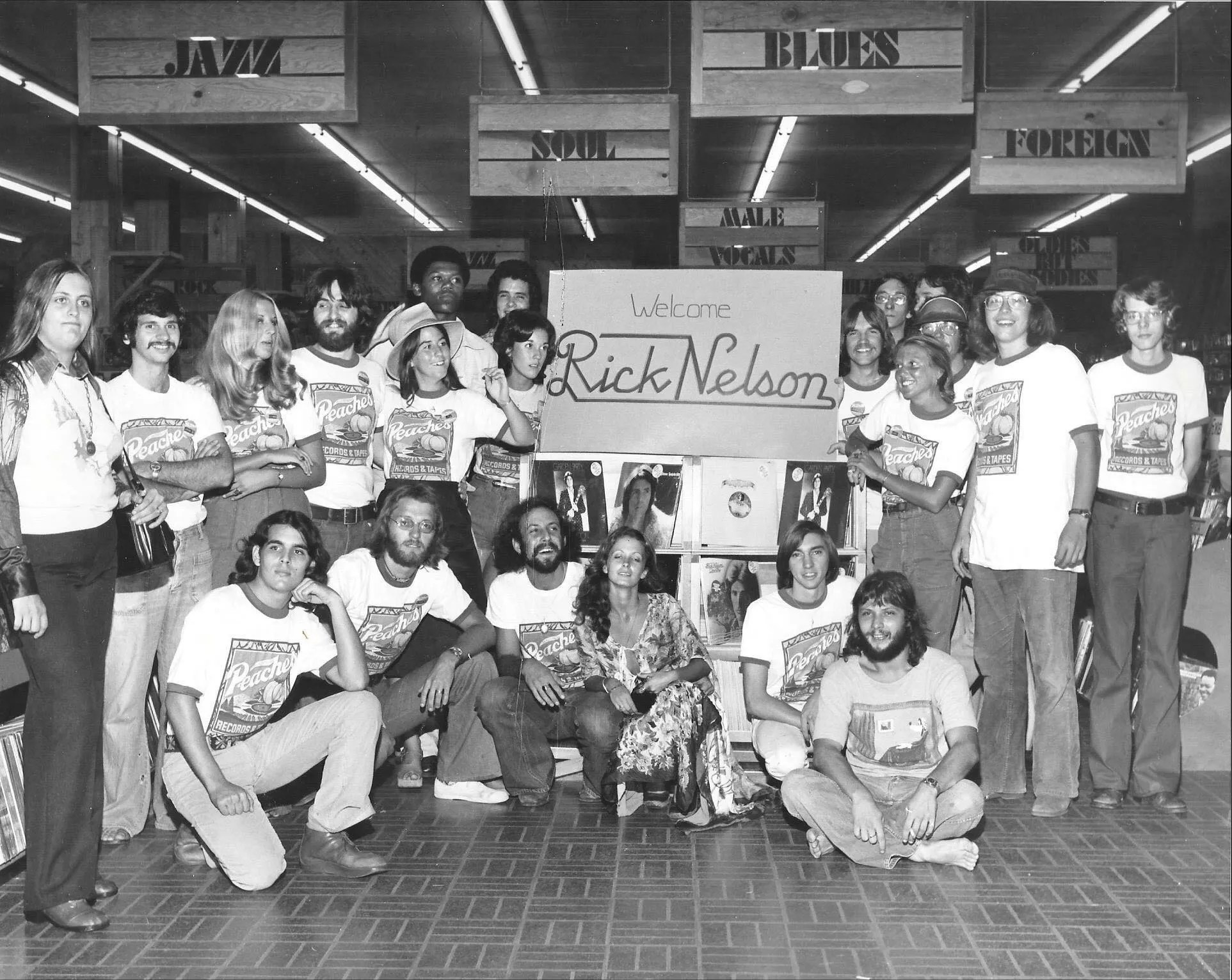 Employees welcome Ricky Nelson for his first in-store appearance in 1975 at Peaches Fort Lauderdale.