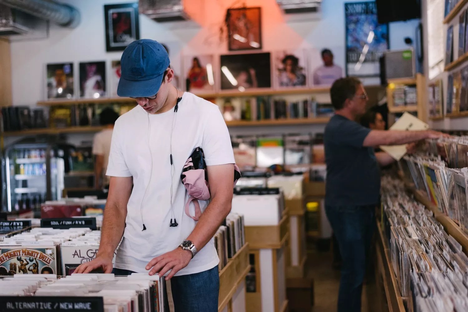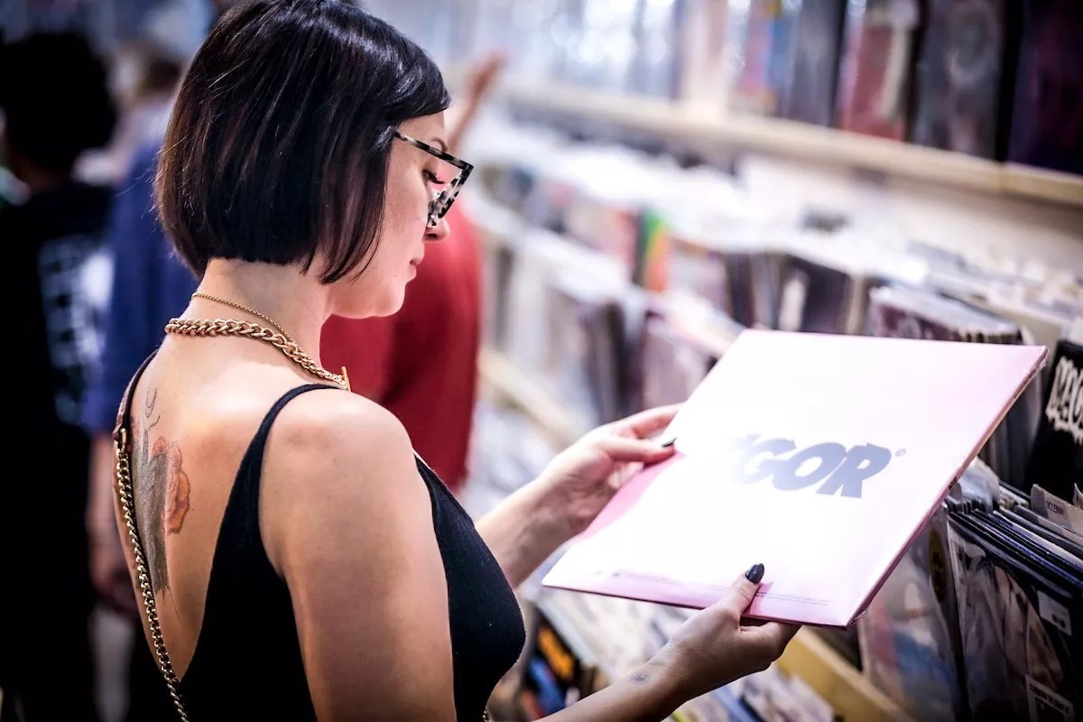 You can still shop in-store for Record Store Day 2020, but unlike this shopper of the past, you'll have to wear a mask.