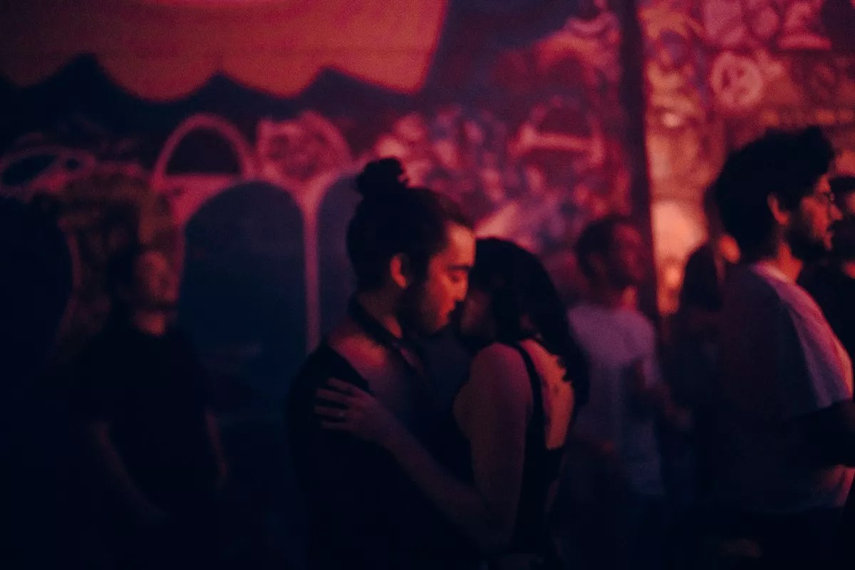 Upon entering, the first section you’ll encounter is the patio. Affectionately dubbed “the Lot,” the venue’s industrial walls are bombed with graffiti, with fresh paint overlapping older, faded pieces. The energy from the DJ booth radiates outward, toward patrons seated at picnic tables under the moonlight. They’re talking to strangers, smiling, exchanging shooters of liquor, rolling joints.