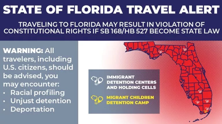 “If either bill becomes law, it would devastate Florida’s communities by increasing the likelihood of racial profiling, diverting local law enforcement resources from safeguarding our communities, and could cost Florida taxpayers millions of dollars and potentially create irreparable damage to immigrant families,” the travel alert states.