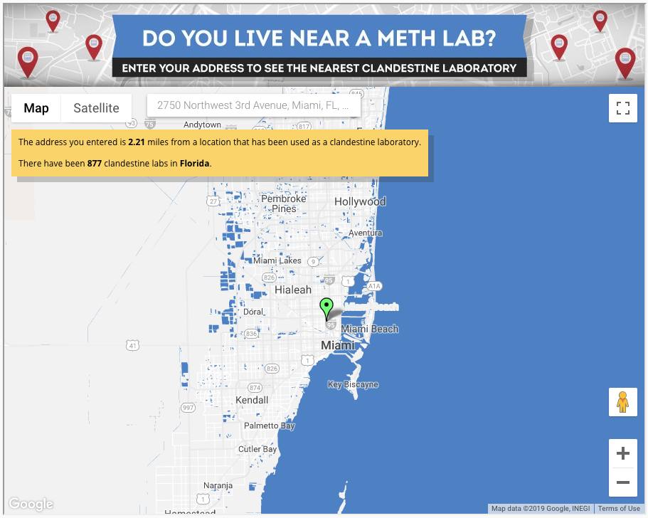 A new analysis by the American Addiction Centers, a for-profit rehab operator, determined there have been 877 meth labs in Florida over the past decade. As part of its report, the company released an interactive map that allows people to see how far they live from sites formerly used to manufacture methamphetamine. A search using New Times‘ address, for example, shows a meth lab was once located a little over two miles away: