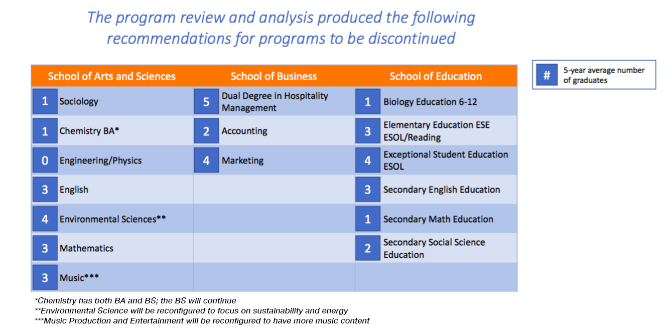 Sharee Gilbert, FMU’s director of communications and marketing, tells New Times the decision to eliminate 18 positions – including staff, administrators, tenured and nontenured faculty, and vacant positions – was not an easy one. Sixteen degree programs in the Schools of Arts and Sciences, Business, and Education will also be discontinued. Gilbert says fewer than five students graduated with degrees from the discontinued programs, which include English, engineering/physics, mathematics, sociology, accounting, and marketing, over a five-year period.
