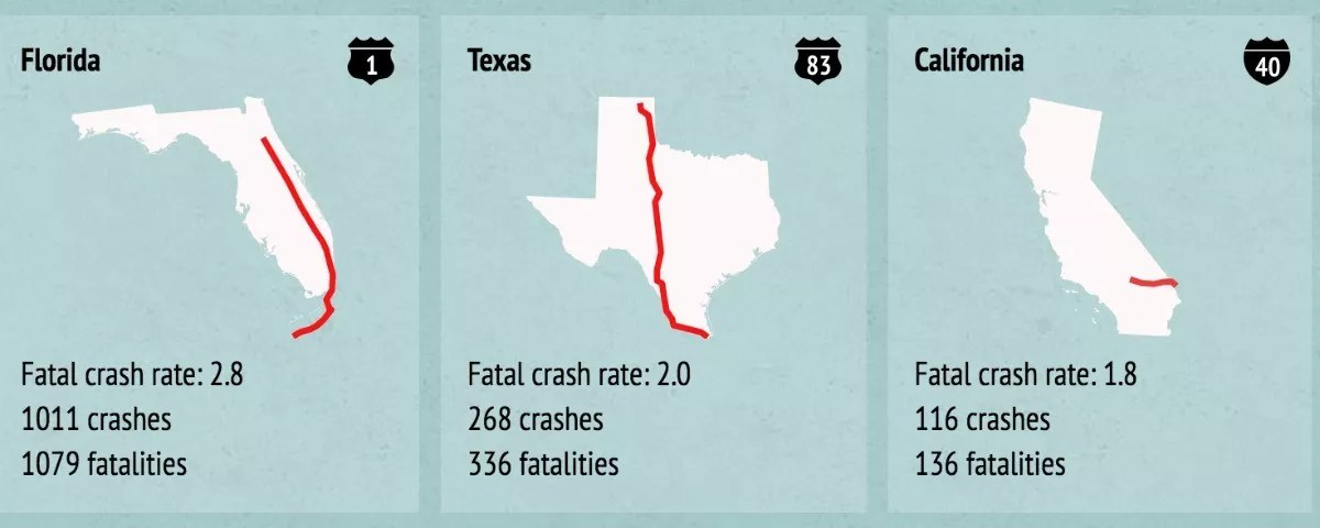 The firm calculated the total number of crashes, fatalities, and a “fatal crash rate” based on those figures – and by every measure, Florida’s long ribbon of U.S. 1 was the worst. Its fatal crash rate easily eclipsed Geotab’s second-place highway, Texas’ U.S. 83; and the third deadliest road, a short stretch of I-40 in California.