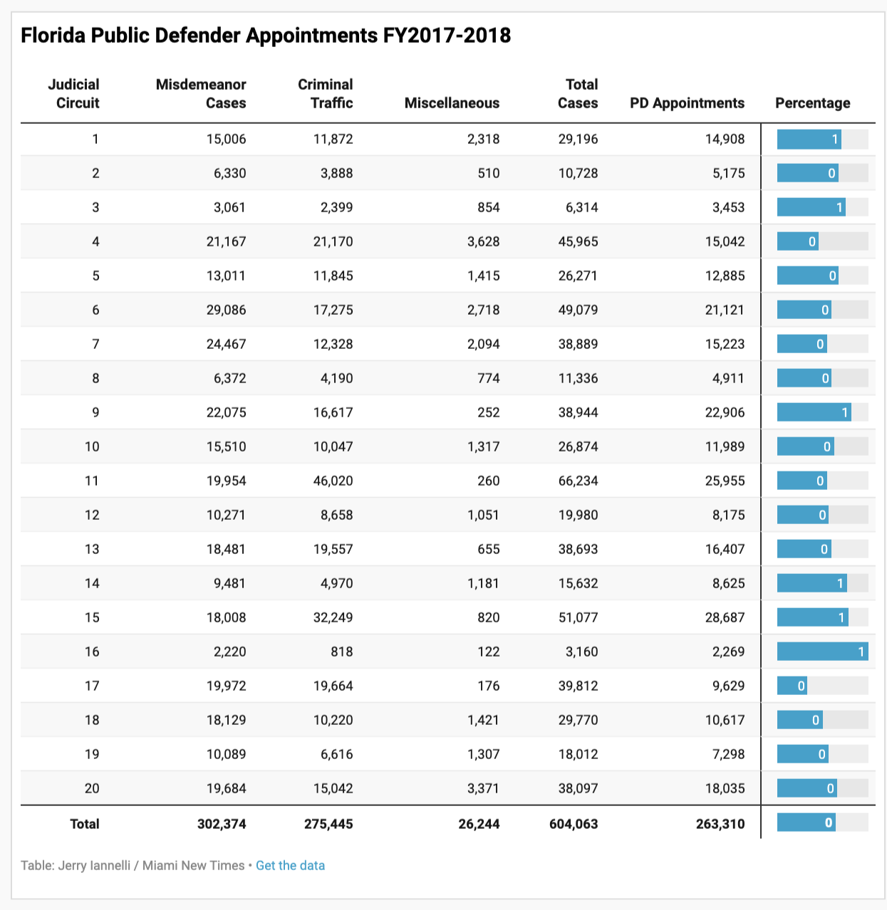 The right to a lawyer is a bedrock principle of the American justice system. But for decades, thousands of defendants have passed through Florida’s misdemeanor court system without any legal representation. For the past three months, New Times analyzed multiple state databases to provide the most accurate estimate to date of that occurrence in all 20 court circuits in Florida – and the results were bleak. Each year, public defender’s offices report their total caseloads to the Florida Public Defender Association. New Times cross-referenced that data with state records to show the percentage of cases in each court circuit where public defenders were appointed in misdemeanor, criminal traffic, and other low-level cases in the 2017-18 fiscal year, the last year for which full data is available.