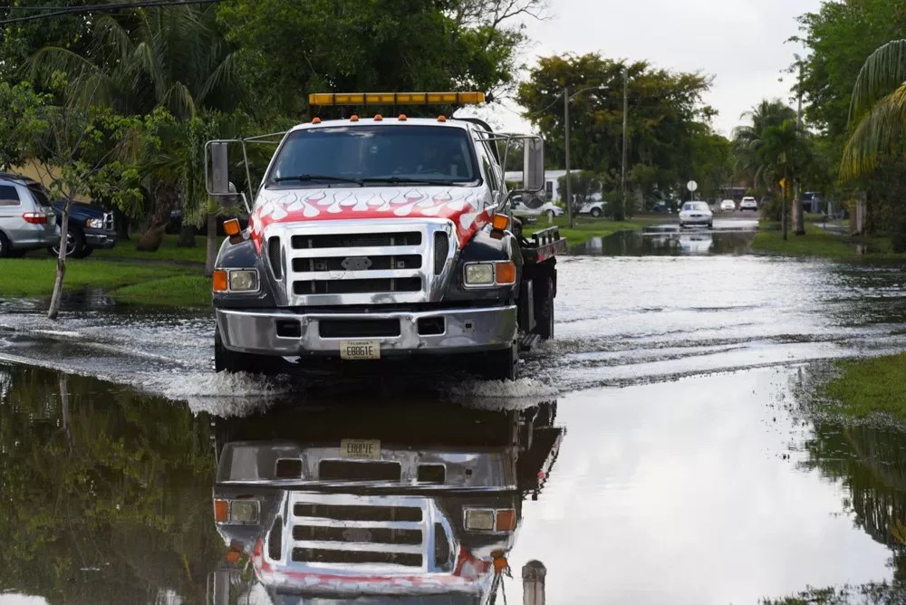 A tow truck removes a flooded car in Fort Lauderdale’s Edgewood neighborhood on April 16, 2023.
