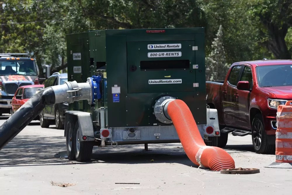 Next to that sign is an emergency pump that has been installed to remove the unprecedented inundation.