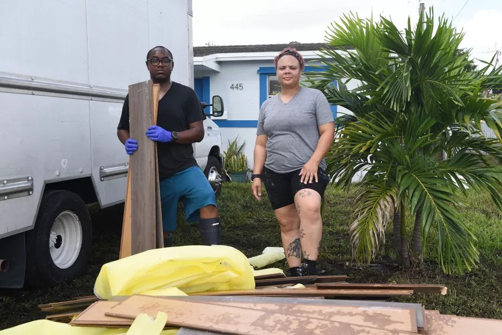Justin Alari and Zach Hopkins lend a hand to their neighbor, Hanna Petrakis, whose home in Fort Lauderdale's Edgewater neighborhood was damaged by floodwaters from an unprecedented mid-April storm.