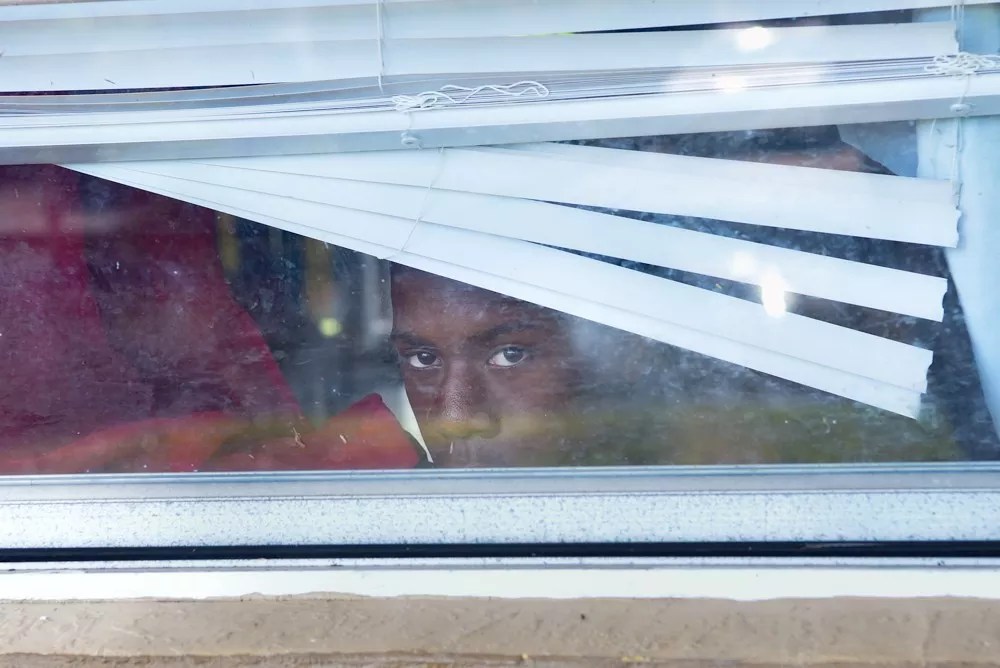 Dayshawn Jones looks through broken blinds from inside the apartment he shares with his mother, Natasha.