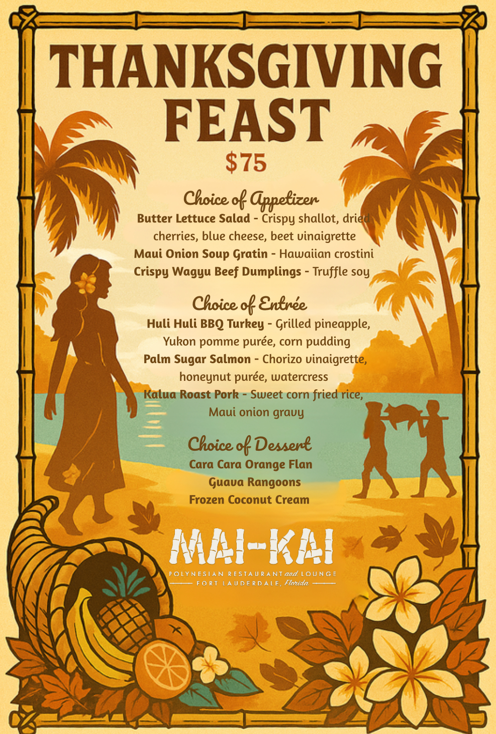 3. Thanksgiving Dinner at Mai-Kai. You can have Thanksgiving at Aunt Gertrude’s. Or you can be surrounded by tikis, Polynesian dancers and have a one-of-a-kind feast. Tough choice! Mai-Kai is having one heck of a Thanksgiving feast, including coconut lobster bisque, roasted turkey, mac and cheese and mango sorbet on top of the usual, stellar entertainment. 3 and 6 p.m. on Thursday, November 22, at the Mai-Kai Restaurant, 3599 N. Federal Hwy., Fort Lauderdale; maikai.com. Admission is $47.50 with