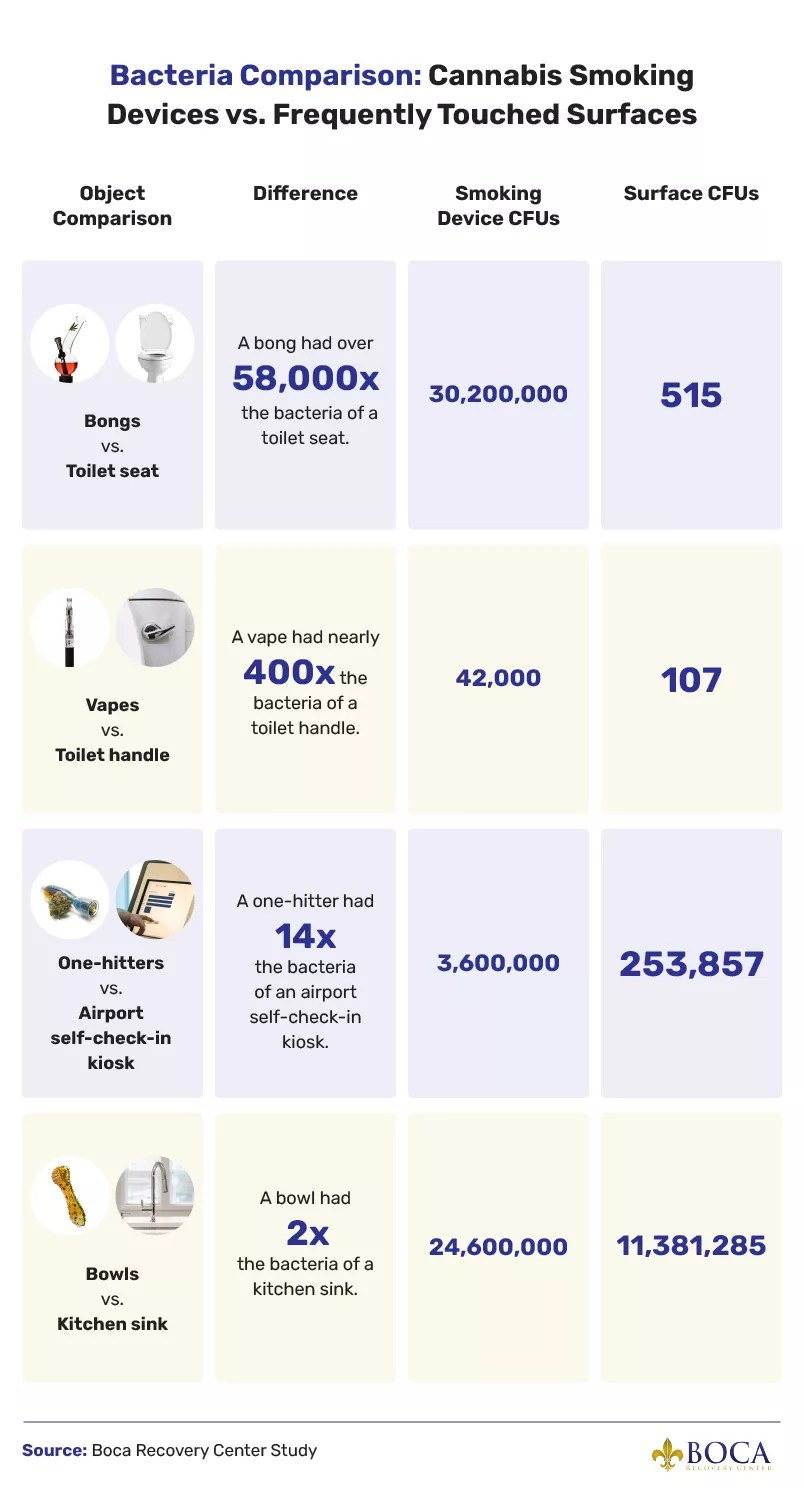 Ah, the simplicity of the one-hitter. Not so fast, says Boca Recovery. The study showed that one-hitters contained 14 times more bacteria than an airport self-check-in kiosk. Your go-to for a quick puff harbors easily enough bacteria to make you sick.
