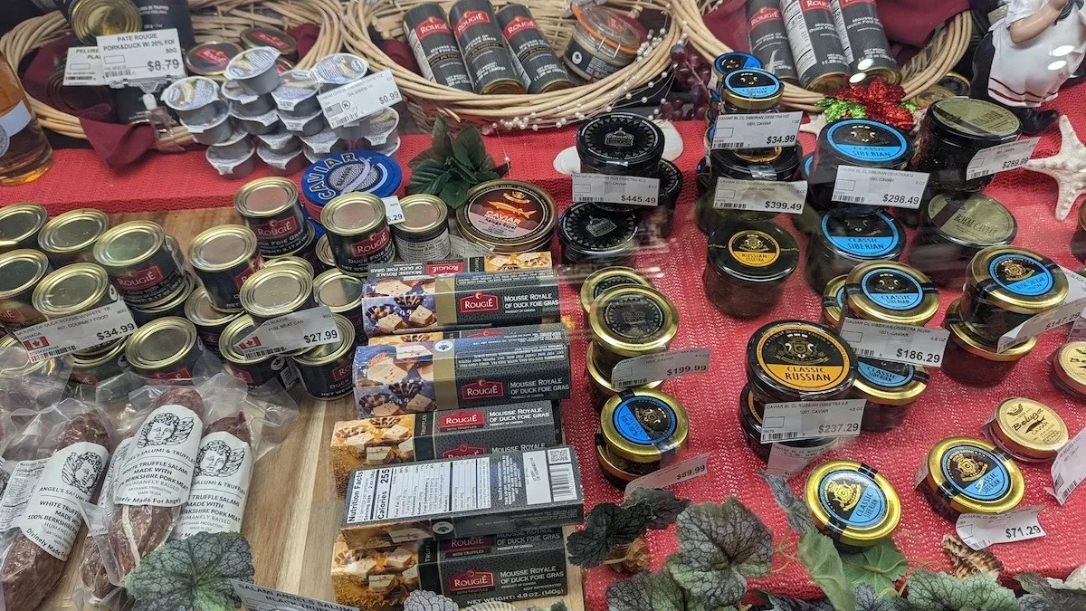 An assortment of caviar and other fine foods sold at Matryoshka Deli Food
