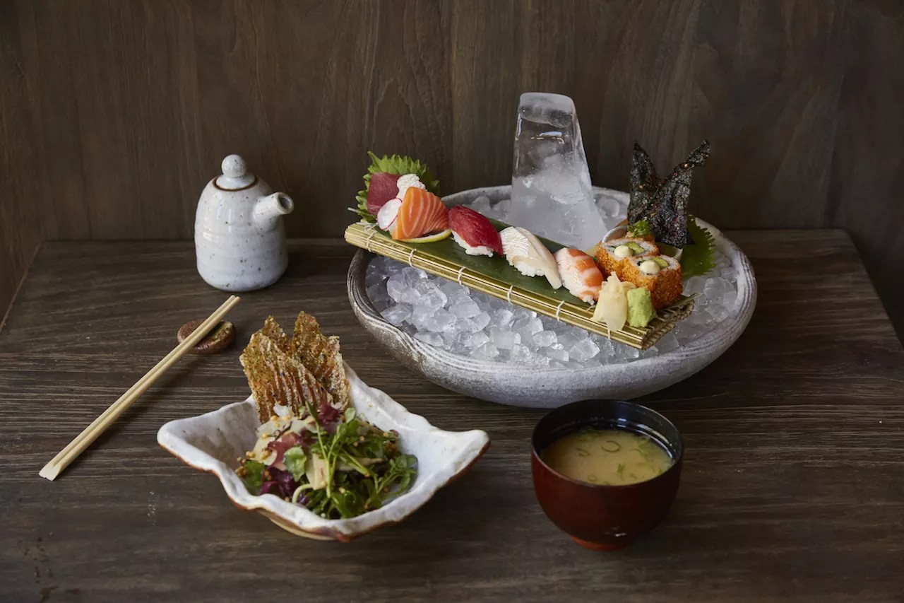 There’s also a Robata option, which includes white miso soup, green beans with asparagus and lime dressing, and a choice of salmon teriyaki, spicy glazed pork ribs with tobanjan sauce, or grilled chicken with spicy lemon miso ($19). The version for sushi aficionados is crafted with white miso soup, seaweed and watercress salad with honey sancho, and a sushi selection with yellowfin tuna, seabass, and salmon sashimi, along with salmon tartar with yuzu den miso with crispy nori, and avocado and cucumber maki with wasabi peas ($22).
